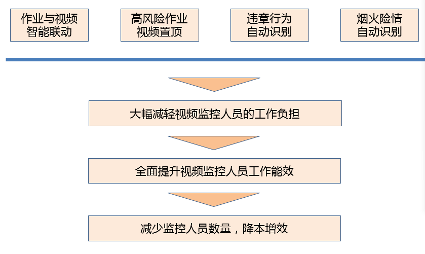 通过作业与视频智能联动、高风险作业视频置顶、违章行为和烟火险情自动识别的技术硬措施,可以大幅减轻视频监控人员的工作负担,通过技术手段让他们很容易集中精力去监管那些作业视频尤其是高风险作业视频,同时AI智能识别也可以避免人员因疲劳或精神不集中而没有识别出风险,全面提升视频监控人员工作能效,甚至可以降低监控人员数量,实现为企业降本增效的目的。