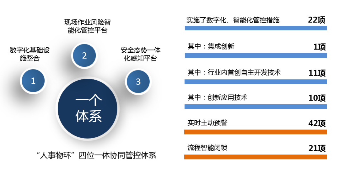 从原来现场安全管理人事物环分散的传统管理模式到“人、事、物、环”四位一体协同管理新模式;从班组-部门-厂部-总部四级安全管理架构转变为监控中心-作业现场的二级架构。