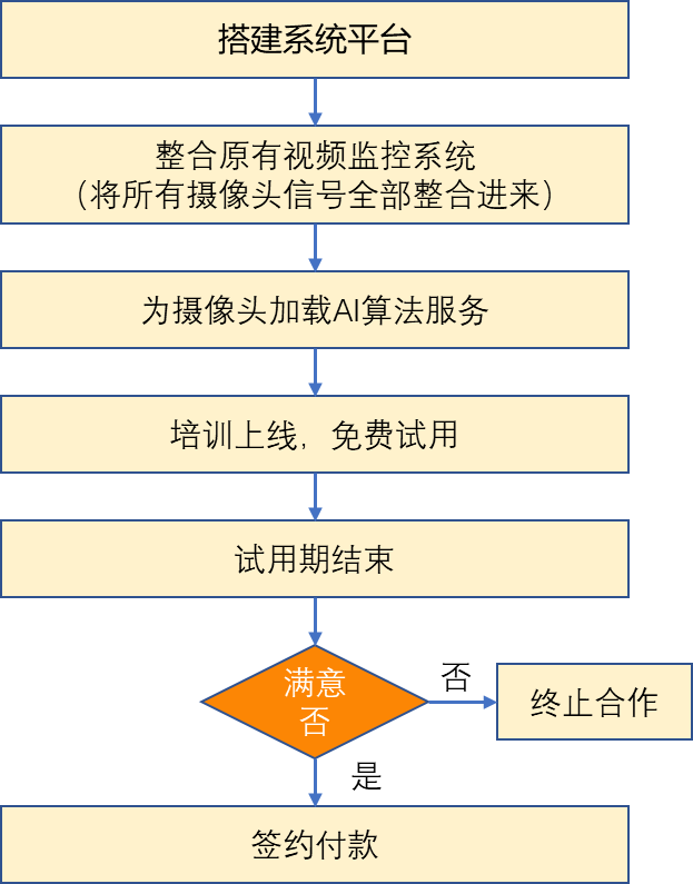 得益于产品的成熟稳定,我们承诺再一周之内完成平台实施工作,快速上线,让客户尽快享受高技术所带来的便捷服务,并承诺提供1个月的免费试用期,满意后再签约付款,全面解除客户的后顾之忧。